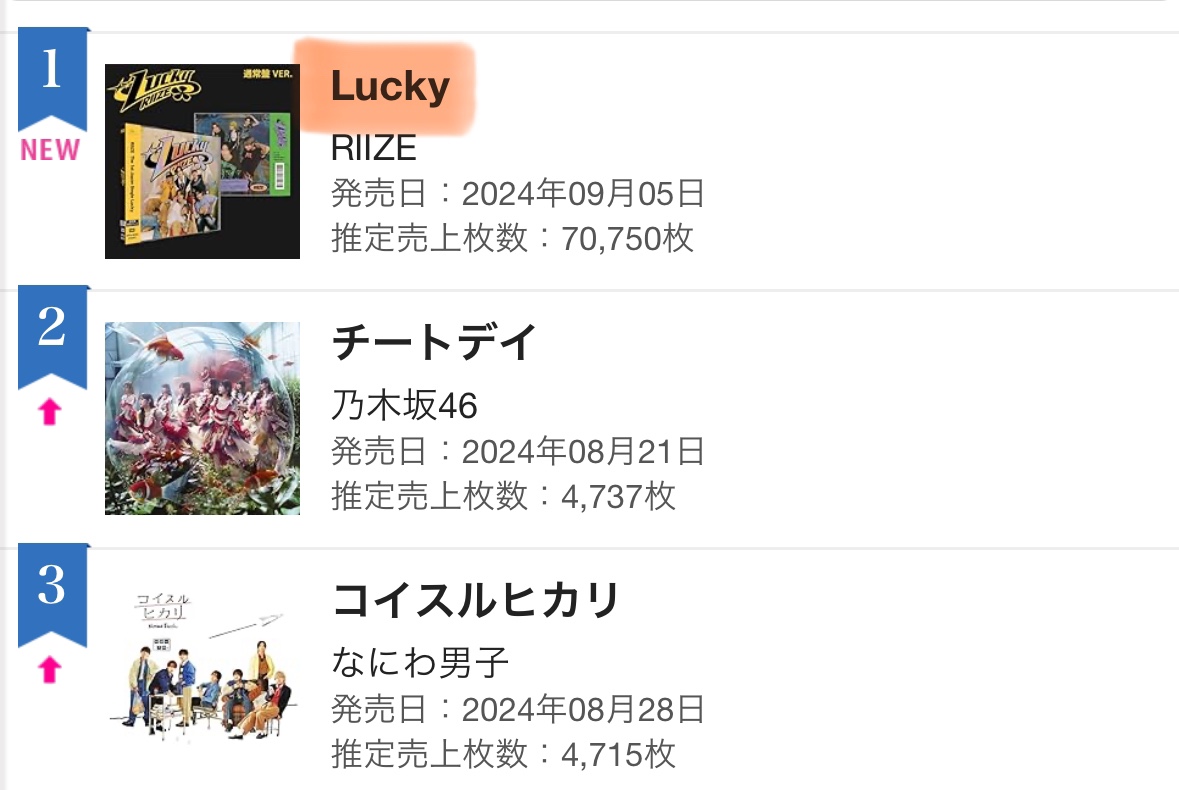 「Lucky」9/4付 オリコンデイリーシングルランキング1位🥇