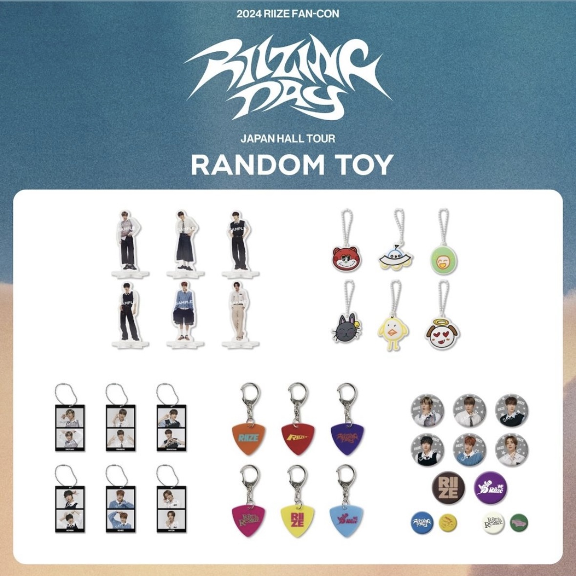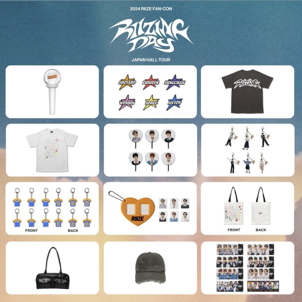 RIIZEが全国9都市15公演を巡る、『2024 RIIZE FAN-CON 'RIIZING DAY' JAPAN HALL TOUR』のグッズ販売が決定いたしました! FANLIGHTアクセサリーやアクリルキーホルダーをはじめ、メンバー自筆のイラストがデザインされたTシャツ、トートバッグなど遊び心満載のアイテムを多数ご用意いたしました!